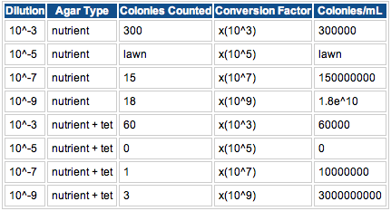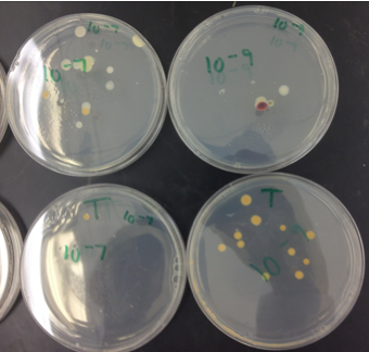 There were differences noted between the plates with antibiotic and the plates without antibiotic. All of the tetracycline plates had yellow colonies. In contrast, the nutrient agar plates varied in color, from red to white to yellow colonies. In general, there was more variation noted on the nutrient agar plates, including different edges on the colonies and the presence of a small lawn on the 10^-5 plate, as well as more colonies. The tetracycline plate colonies appear to have entirely even margins.