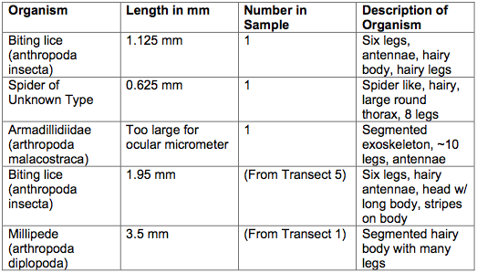 The size range is from 0.625 mm (the spider) to larger than the ocular micrometer (Armadillidiidae). It is impossible to determine exactly what kinds of organisms are most common in leaf litter because we only obtained one of each sample. From the phyla, it appears that arthropoda are common in leaf litter. Although we identified many arthropoda, there are other invertebrates that are vital to the transect.