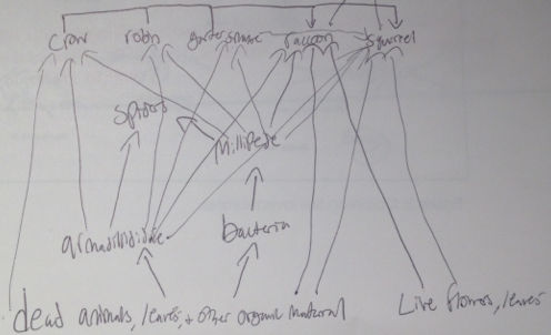 Food web shows energy flow between bacteria, plant matter, invertebrates, and vertebrates. This diagram is just of the identified organisms of transect #3; our group acknowledges that there are many, many more organisms that we did not identify and are not on this web.