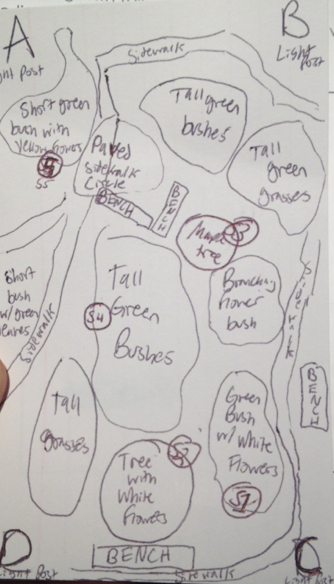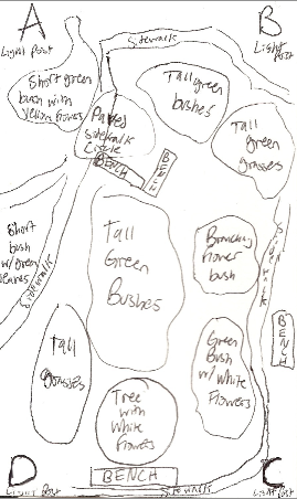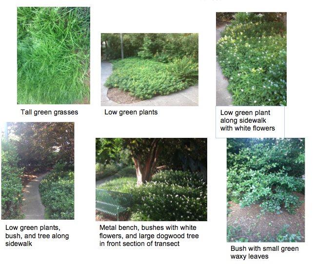 Below is a sketch diagram of the parts of the transect and numerous photographs. The transect is on flat, level ground with the exception of some small beds that are mound shape. In addition to the trees and plants noted, some small flying insects were present in the transect. The trees create a large amount of shady area.