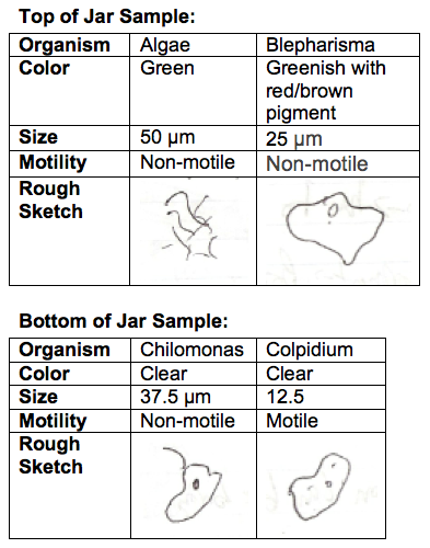 In the top of the jar sample, green algae and blepharisma were observed. The sample from the bottom of the jar revealed chilomonas and colpidium. Blepharisma, chilomonas, and colpidium are all protists. The algae observed was green, non-motile, and approx. 50 µm long. The blepharisma was greenish brown with a red brown pigment, non-motile, and approx. 25 µm long. The chilomonas was clear, non-motile, and 37.5 µm long. The colpidium was clear, motile, and 12.5 µm long.