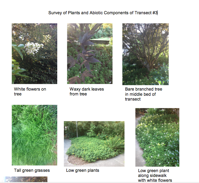 Visual analysis was completed of transect #3. The transect was walked numerous times and observations on biotic and abiotic factors were recorded. A diagram of the plants and abiotic factors was sketched out. Photos were taken from an aerial view by standing on some of the benches. In addition to the photos taken from above, some were taken at standing height to record the survey of plants, trees and bushes.