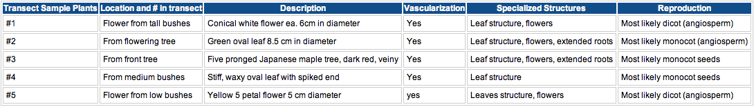 Table 1 shows the characteristics of the five plant samples obtained from transect #3. Each plant was similar in that they were vascularized, but they each had different specialized structures. Classification on reproduction was estimated using the monocot vs. dicot table in the lab manual to characterized observed morphologies as no seeds were available for analysis.