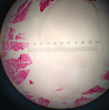 This image shows the gram negative colony of bacteria from the 10^-9 nutrient agar petri dish at 1000x. The red seen in the photo is from the wax pencil, there is no stained bacteria present.
