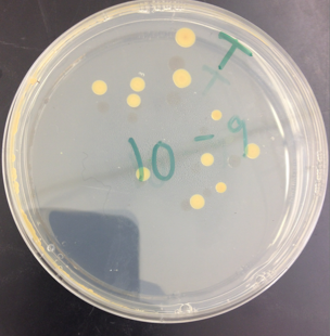 The effect of tetracycline on the total number of bacteria is somewhat unclear. Compared to the nutrient agar plates, the 10^-5 and 10^-7 tetracycline plates had no colonies. The 10^-3 and 10^-9 colonies did have more colonies than their sister plates without tetracycline. I believe tetracycline had an effect and limited bacteria growth significantly, however, the reason why the results appear as they are might be due to cross contamination with the spreader when placing the bacteria in the plates. The spreader was not sterilized in between spreading bacteria in the regular agar plates to the tetracycline plates. This may explain the high number of bacteria observed on the lowest concentration nutrient agar + tetracycline plate. The tetracycline seemed to cause a yellow color change in the bacteria. It appeared that one species of bacteria is unaffected by tetracycline.