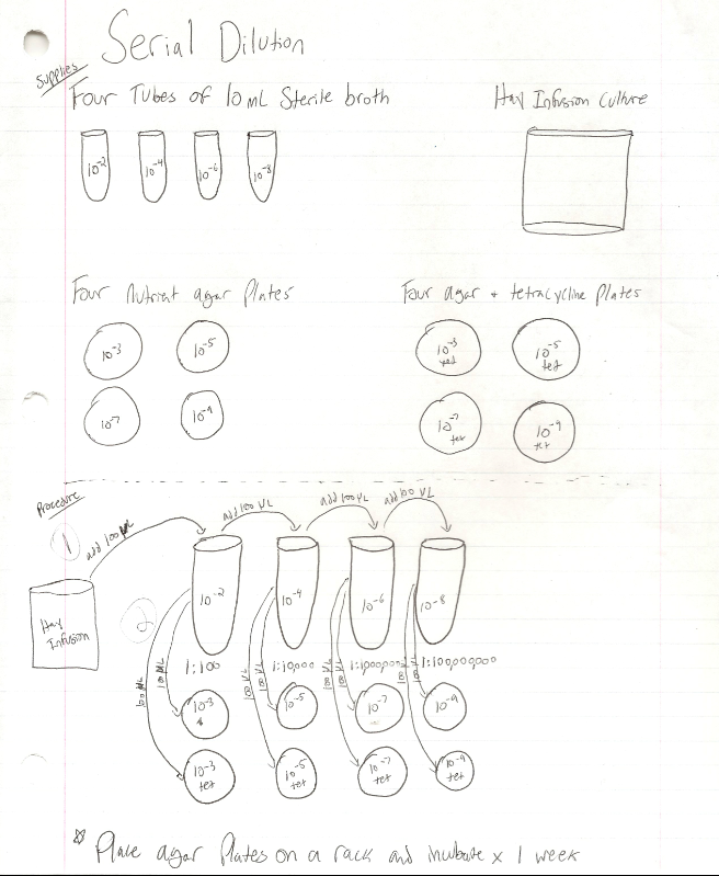After the hay infusion culture analysis, serial dilutions were performed in preparation for the microbiology lab. A 10^-2, 10^-4, 10^-6, and 10^-8 dilution was made and they were each spread on both a nutrient agar plate and a tetracycline plate. See below diagram of the serial dilution procedure.