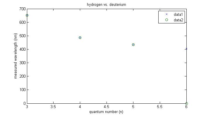 - Figure 6 shows the wavelengths (in nanometers) for hydrogen and deuterium together versus the Balmer series' quantum numbers. Hydrogen is indicated by an 'x', deuterium by an 'o'. As in Figures 4 and 5, it is not evident from this graph exactly how the two isotopes compare,though they seem very close.