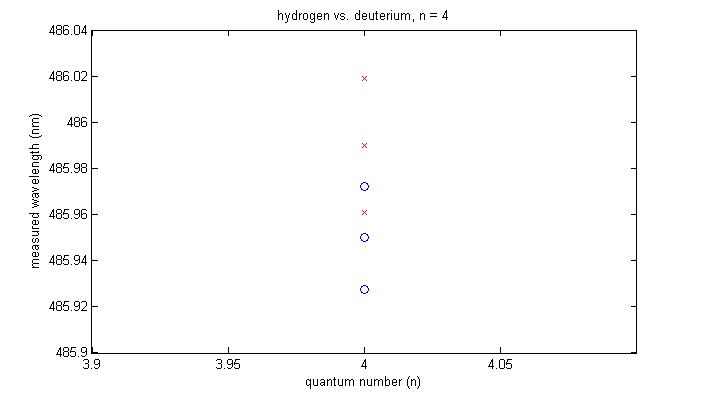 - Figure 7 shows the average wavelength and standard errors of the mean for hydrogen and deuterium at n = 4. The red 'x's are hydrogen data, blue 'o's are deuterium. Each trio of markers consist of an upper and lower error bar and a central average wavelength. We observed that the lower error bar for hydrogen overlapped with the upper error bar for deuterium, showing that our instrument and experiment were not precise enough to detect the difference in the wavelengths or Rydberg constants for hydrogen and deuterium.