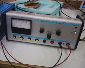 We rinsed and dried the capacitor plates and used the focusing wire to calibrate the viewing scope, first adjusting the grid and then attempting to bring the wire into better focus, with less success than we would have liked. The focusing wire seemed strangely tilted, but it wasn't very secure in the drop chamber.Tyler explained why we needed to use the droplet hole cover to decrease horizontal drop drift. We set our power supply to 500.5 V,