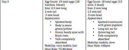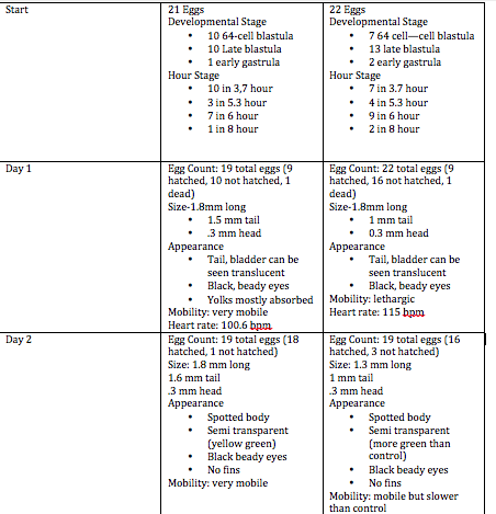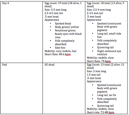 Embryology of Zebrafish March 24 2014 Question: How will fluoride affect the embryological growth of zebrafish? Specific Steps preformed: First we read a lab report that already documented the affects of fluoride in tadpoles. Then we set up 2 petri dishes with 20 zebrafish eggs and 20mL of water, one with fluoride and one as the control with normal water. We then recorded data on their changes as the days went by. We calculated their heart rate, and wrote down their physical development and attributes. We put 3 zebrafish in 4% formaldehyde for future observation underneath the microscope. Raw data: