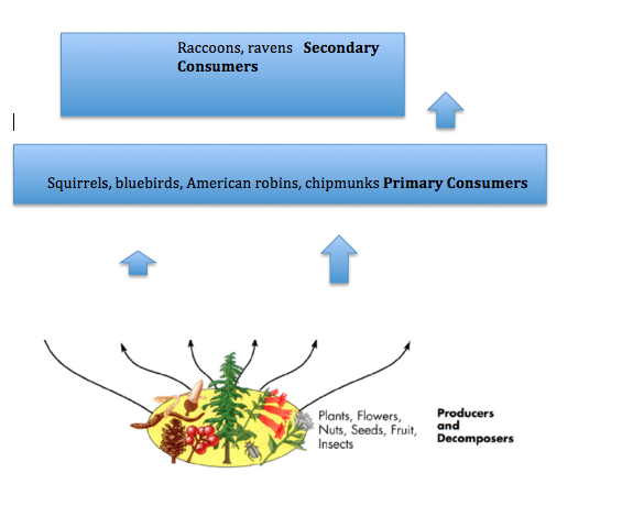 These animals could survive in my transect off of the habitat provided. There is green grass for the squirrels, chipmunks, and raccoons to scavenge for fallen nuts on the ground. The birds could live in the trees and build their homes in the branches.