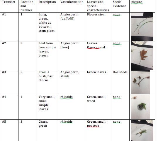 Overall, I think this lab was helpful in understanding plants and their vascularization systems. I am excited to see what will come out of our berlese funnel next week-and what invertebrates we will be able to find from our transect.