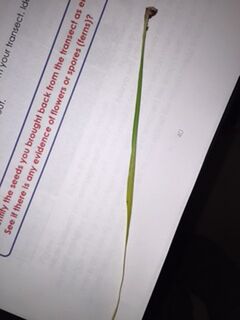 The first plant we collected was location right next to the rock path in our transect. This plant was a long skinny piece of monkey grass. Its color was light green and it had a nice light brown stem. This sample has parallel vascularization with veins and its mechanism of reproduction was flowering. The second plant we collected was located by the bottom right tree in our transect. This tree was tall and round with a lime green color with sporadic brown specks throughout. Its vascularization was net like and its mechanism of reproduction was flowering. The third plant we collected was located near the rock path and it was a piece of monkey grass with two leaves connected to one stem. This plants vascularization was parallel and its mechanism of reproduction is flowering. The fourth plant we took was located towards the bottom left portion of our transect. This plat was a purple curved leaf. Its vascularization was net like and its mechanism of reproduction was flowering. The fifth and final plant we collected was found on the tree located in the back right of our transect. This plant was a dead brown leaf. Its vascularization was net like and its mechanism of reproduction was flowering.