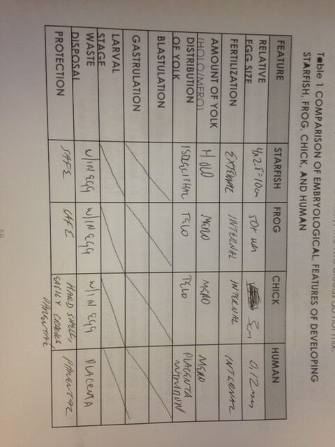 Procedures had the scientist observe the embryonic development of a starfish embryo, a frog embryo, and a chick embryo respectively. Table 1 shows the comparisons of the three observed embryos, the fourth observation being the embryonic development of a human.