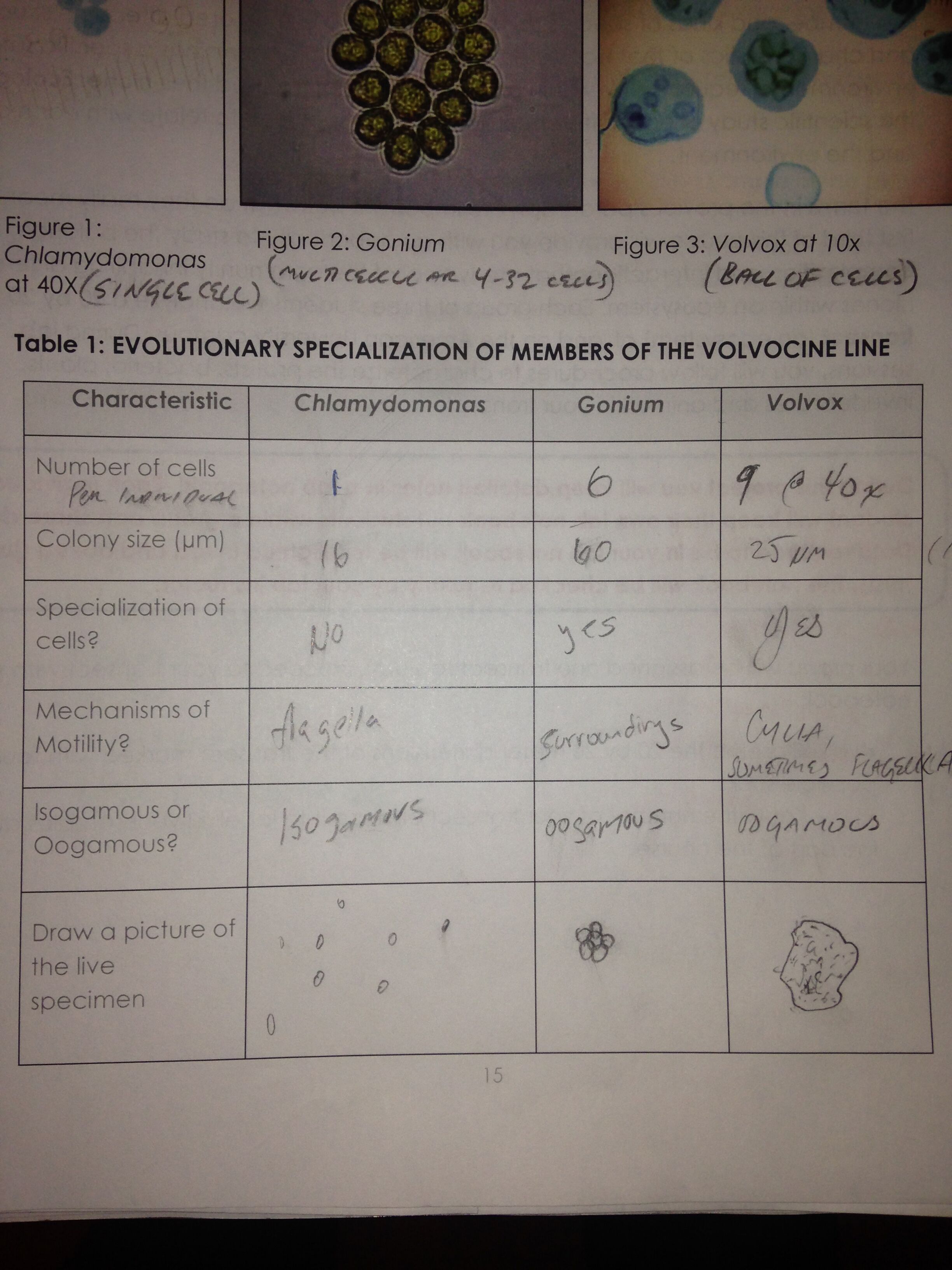 Materials and Methods The first part of Lab 1 involved viewing of the Volvocine Line under microscope. The cells viewed were Volvox, Gonium, and Chlamydomonas, shown below (Image1). The number of cells varies throughout the Volovcine Line, but typically Chlamydomonas shows a single cell, Gonium presents from the 4-32 cell range, and Volvox appears as a great ball of cells. The results shown below indicated this in subdued form. After the Volvocine Line cells were viewed, the second part of the experiment involved moving to the assigned groups transect. A 50ml transect sample was taken and the procured samples documented (Image 2). Upon returning to the lab, a Hay Infusion Culture was created using 10 grams of the transect sample and 500mLs of Deer Park water. After that, 0.1g of powdered milk was added to the jar for nutrients for the living organisms and was mixed to evenly distribute the powdered milk throughout the sample.