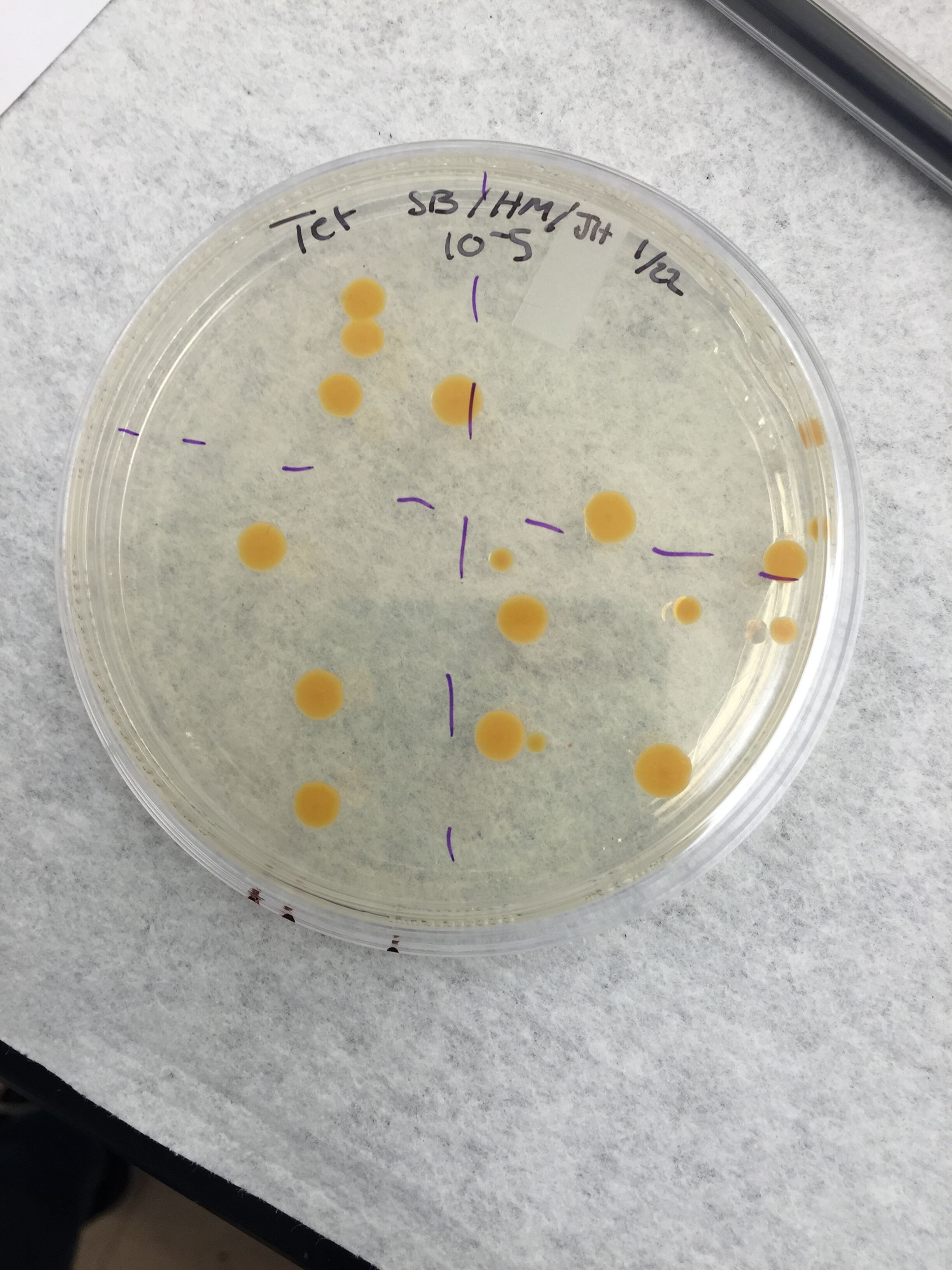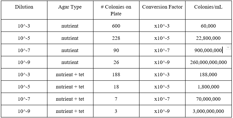 The higher the dilution, the more colonies there would be on the plate. Plates that had Tetracycline present had fewer colonies compared to the plates without Tetracycline. Likewise, the Tetracycline positive plates only had one type of bacteria growing versus the three types growing on the Tetracycline negative plates.