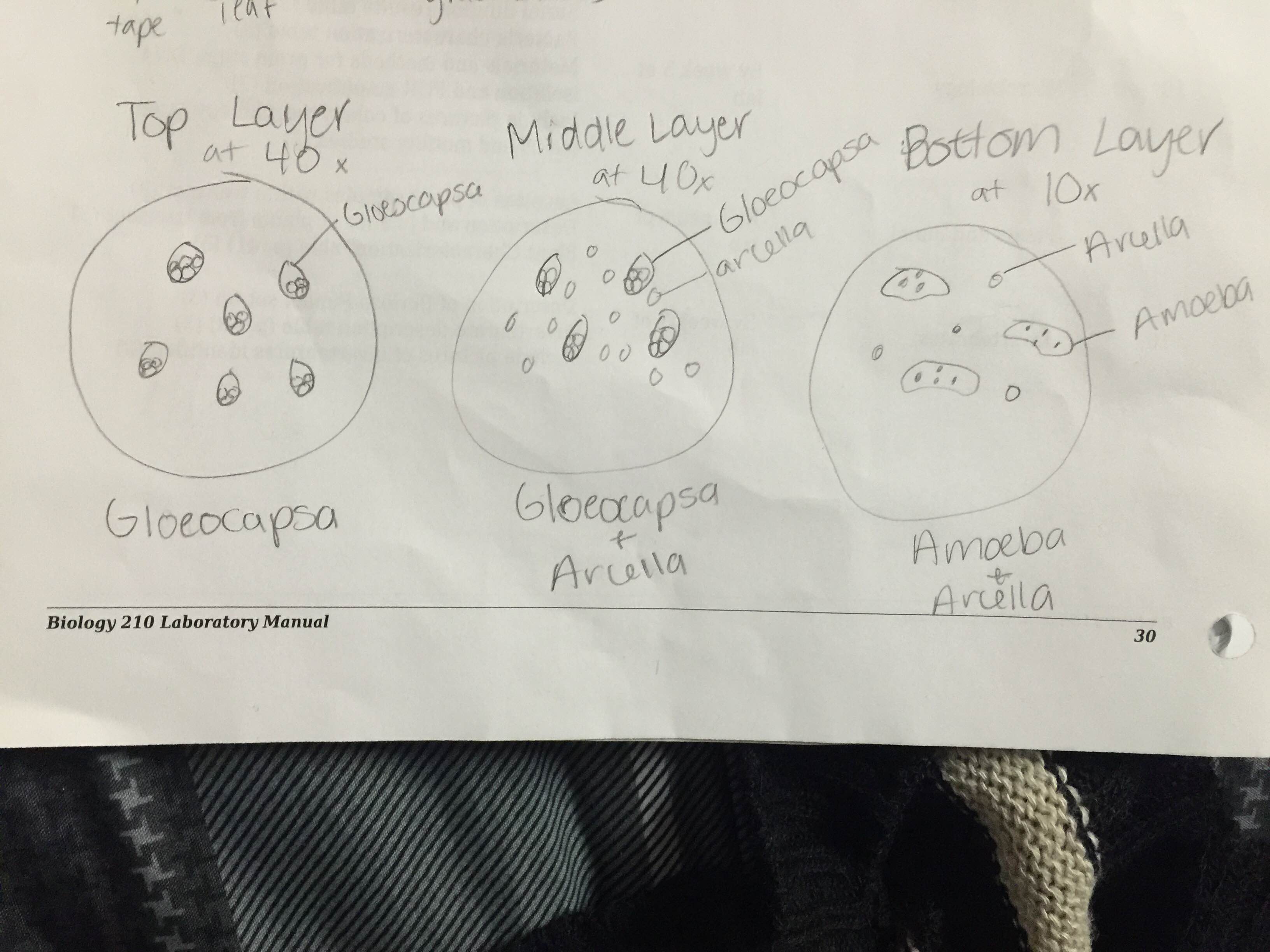 Among the three layers we took samples from, we found three different organisms. We found Gloeocapsa, Arcella and Amoeba. Towards the top of the jar Gloeocapsa was found. In the middle layer Gloeocapsa and Arcella were found. The bottom layer was where Amoeba and Arcella were found. Arcella are protists, while Amoeba and Gloeocapsa are algae. Gloeocapsa are motile, photosynthesizing algae found under wet rocks or wet dirt. When measured with the ocular micrometer, they measured to be five micrometers. They are green in color and are circular in shape. Arcella are also circular in shape, and green but are ten micrometers. Arcella are can be found in mosses and soil. Amoeba under the microscope appeared to be white with green dots and had an abnormal circular shape. Amoeba, just like Arcella, can be found in soil.
