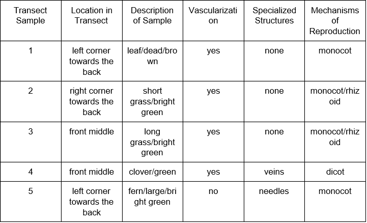 Overall, there was not much variation in the plant life in the transect. Most of the plants in the transect are leaves from the tree, needles from a fern and grasses. The plant life is not flourishing due to the harsh temperatures. This could be the reason why the leaves from the tree are dead and there is not a lot of plants growing.