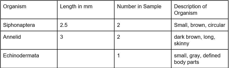 In order to identify invertebrates living in our transect, a Berlese Funnel was set up. To set the funnel up, a 25 mL solution of ethanol and water was added to a 50 mL conical tube. A small piece of screen material was taped to the bottom of the funnel to prevent large materials from falling into the ethanol and water solution. Then,parafilm was used to attach the conical tube to the bottom of the funnel. The funnel and conical tube were placed on a ring stand 2 inches below a lamp and leaf litter from the transect was placed in the funnel. Lastly, the funnel was covered with foil and left to sit for about a week.