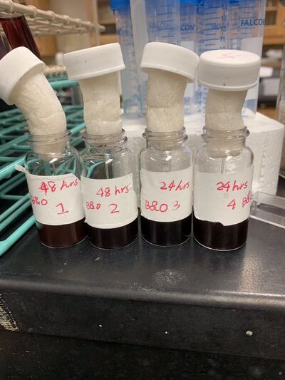 After testing the absorbances with the UV monochromator, we cut the electrodes and had them immersed in the solutions to test the gold nanoparticles. As we observed, only one of the electrodes that we put in the previous 1, 2, 3, and 4 samples had the carbon fiber. Therefore, we needed to put new electrodes in 1, 2, and 3 samples for one time to do the test. Additionally, we had 4 electrodes immersed in each newly made samples - 6D, 7D, 8D, and 10D and divided them into two groups - one for 24 hours and the other for 48 hours.