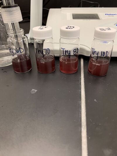 For today's experiment, we used the UV monochromator to test the boiled samples. As all the intensities showed the normal results, so we assumed that this group of samples was good to test the pH values. Therefore, we used the pH meter to test the pH values so that we could decide what pH range could be suitable for the production of gold nanoparticles. However, the thing that really surprised us was that the pH values for these samples were really low and the effective production of gold nanoparticles could not be ensured in the acidic environment. Therefore, for the next time, we will add more base to the samples to compare with the absorbances of other samples. With these comparisons, we can determine if we need to add more base to the gold samples to create the appropriate basic environment before boiling them or adding the base solution the gold samples after boiling them to ensure the high production. Consequently, we still need to prepare the new samples and adjust the pH values for the next time with using the pH meter by adding more base to test tubes. We got new Tryptophan 5mg 6D, Tryptophan 5mg 7D, and Tryptophan 5mg 8D samples boiled in the water bath at 80 Celsius degrees and Tryptophan 5mg 10D sample in the oven with the settings of a heating temperature of 90 Celsius degrees and heating time for 2 hours and 15 minutes.