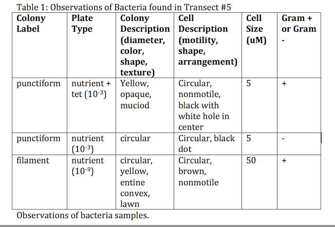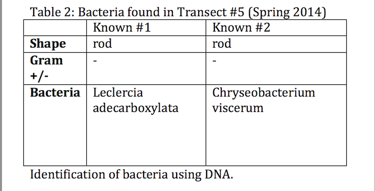 Although our bacteria samples failed to be analyzed, by investigating those found Transect #5 in Spring 2014 we are able to gain a more detailed idea of the types of bacteria that inhabit the wildlife habitat. Bacteria play a vital role in shaping the ecosystem of Transect #5. For example they are primary producers, providing food for many organisms higher up in the food chain (Freeman et al. 2014).