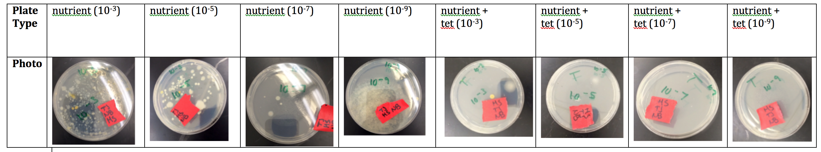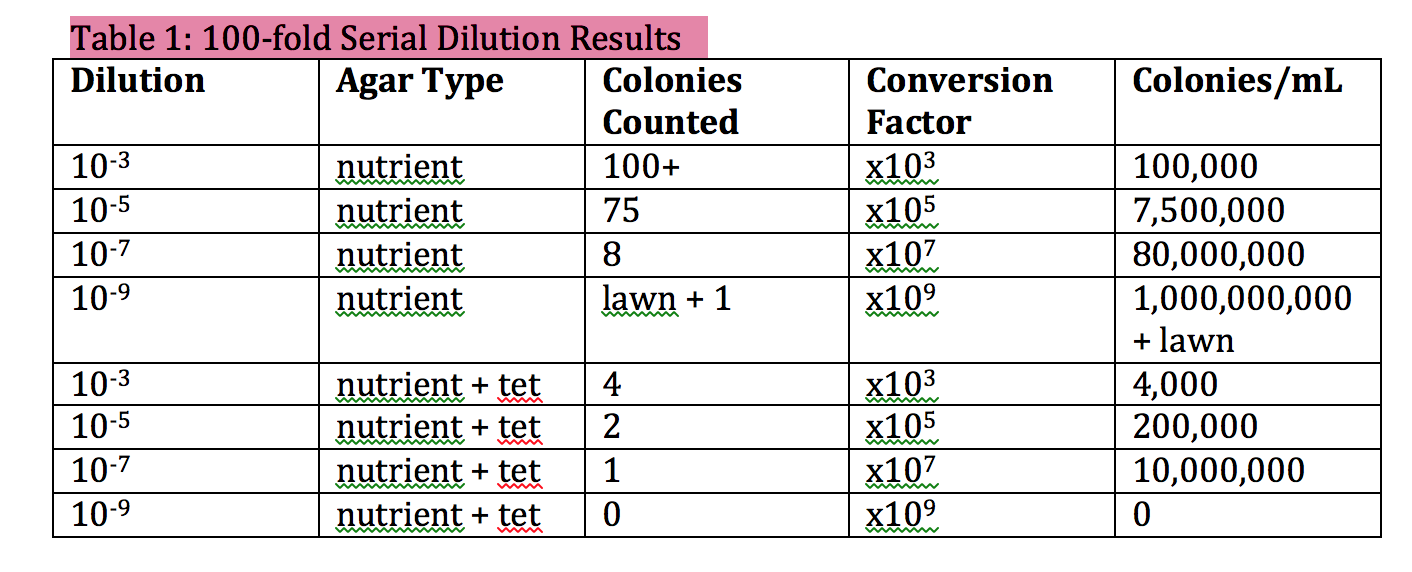 1. Compare the colonies on the agar nutrient plates to those on the agar + tetracycline plates (Bentley et al. 2014)