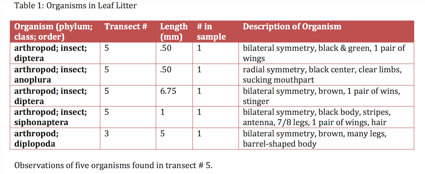 As the leaf litter samples placed in the Berlese funnel were taken from the ground, the majority of organisms are arthropods (Bentley et al. 2014). The organisms found in transect #5 range in size from .50 mm to 6.75 mm. Both the smallest and the largest organisms found in transect #5 were diptera, flies. Diptera were also the most common organism with two found in different parts of sample.