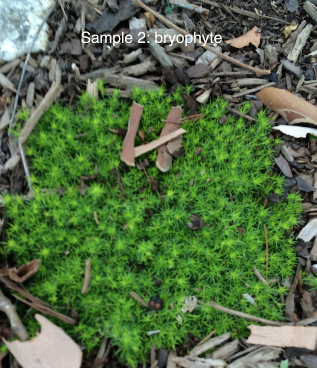 Sample 2 is a bryophyte, an early plant with minimal specialization. Instead of roots, it has rhizoids, which increase its available surface area and allow it absorb water and diffuse gases. Rhizoids also enable bryophytes to anchor to the ground (Bentley et al. 2014). Bryophytes appear in a few patches along the ground of transect #5.