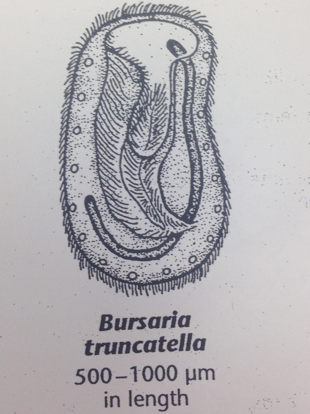• Bursaria Truncatella: large body, large open mouth, cilia, protest, non-photosynthesizing