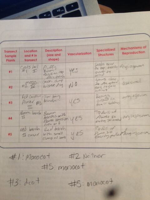 Purpose: During the experiment a leaf litter and plant samples were collected from Transect 1. The samples were used to understand how biotic organisms could be differentiated and categorized. The three focused features were a presence of vascularization, specialized structures, and mechanism of reproduction.