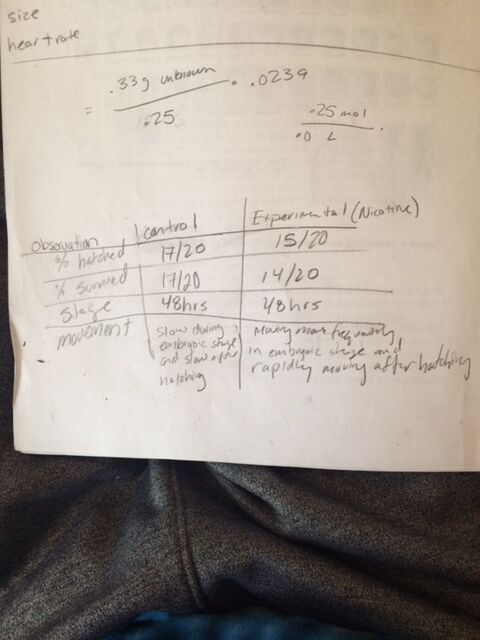 Methods: The first step of the experiment was to create a control and experimental group by adding 20ml of water to each petri dish. Soon after, 20 healthy translucent embryos were added to each dish. Then 4ml of 33mg/L of nicotine was added to the experimental petri dish.They were all observed, recorded, and fed though a two week period (as can be seen below).
