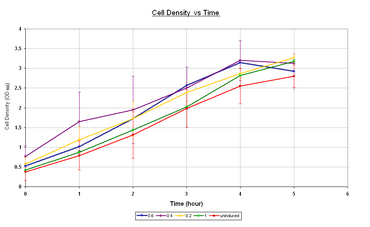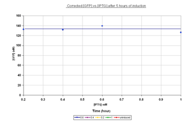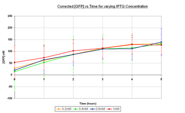 | Figure 1.1 it can be seen that the growth rate of the E.coli containing the I7107. All samples appear to follow the same pattern of growth, with an initial lag phase followed by an exponential phase of growth. However, within the results there is clear variation. This variation is due firstly to the fact the overnight cultures added to media were not added in terms of cell population but rather a standard volume of overnight culture was added. Other variation is due to intrinsic E.coli variation and the nature of data collection (see below). Figure 1.2 shows the corrected [GFP] vs time for different concentrations of [IPTG] inducer. Corrected [GFP] was calculated by normalising by the OD600, background removed by removing the uninduced fluorescence and finally the fluorescence was converted into [GFP] using a calibration curve. As it can be seen there is an initial [GFP] this is because there was no negative sample to remove the background fluorescence of the cell. As it can be seen all samples increase over time, with an initial lag phase which continues into a exponential phase and appears to be reaching steady-state towards the end of the sampling. When look at these results in context of a transfer function, figure 1.3, we see that we are in the upper threshold of response where our system is saturated to inducer. The transfer between the lower and upper threshold was not captured within this data and is clearly an area for future work.