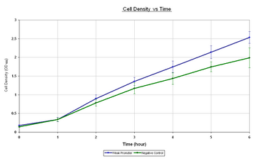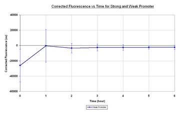 | Figure 1.1 it can be seen that the growth rate of the E.coli containing the I20260 is lower than that of E.coli with no plasmid. Both samples appear to have an initial lag phase for the first hour followed by the exponential phase for the remainder of the experiment. The reason for the slow growth rate of I20260 could be put down to the expression burden that I20260 is placing on the E.coli. Figure 1.2 shows the corrected fluorescence vs time. Corrected fluorescence was calculated by normalising by the OD600 and taking away the negative control to remove background fluorescence. As it can be seen by taking away the negative control we get an negative initial value that increases over the first over and reaches a steady value for the remainder of the sampling. The reason why the negative control fluorescence is higher is not known, however it is clear that throughout the sampling there is minimal GFPmut3b expression from the I20260. The steady-state reached at 1 hour could be due to inaccuracies in the initial measurement or due to a true steady-state of GFPmut3b per cell.
