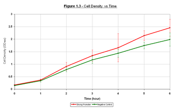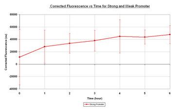| Figure 1.1 it can be seen that the growth rate of the E.coli containing the I20259 is higher than that of E.coli with no plasmid. Both samples appear to have an initial lag phase for the first hour followed by the exponential phase for the remainder of the experiment. The reason for the faster growth rate of I20259 could be due to a higher initial concentration of E.coli added to the media. Figure 1.2 shows the corrected fluorescence vs time. Corrected fluorescence was calculated by normalising by the OD600 and taking away the negative control to remove background fluorescence. As it can be seen there is an initial value at time 0, this is due to the consitutive expression of GFPmut3b in the overnight culture that was used to inoculate fresh media at time 0. From this initial value we see fluorescence increases for the remainder of the sampling, however appearing to reach a steady-state towards the end of the sampling. It is difficult to tell if this is a true steady-state due to the massive variation within this data.
