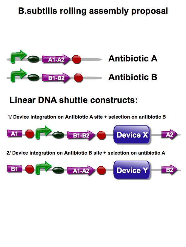 Our current strategy for insertion of multiple devices into the genome of B.subtilis is to integrate these devices as different defined positions within the genome. However an alternative is to develop a rolling assembly strategy that enables combination of devices at one loci within the genome.The possible advantages for this are as follows:
