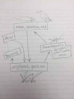 A biotic feature that these organisms would benefit from within this transect would be the various vegetable patches. They provide food for the rat, sparrow, American robin, pigeon and deer. In fact, we found deer hoof prints in the vegetable patch. The rat, sparrow and American robin will also eat the invertebrates that live in the transect. In terms of abiotic features, rats and birds could utilize the random stick and twigs for shelter. The community of the transect is diverse and the organism interactions ultimately sustain the community. The two birds and the rat are at virtually the same trophic level since they all consume insects and vegetation. The carrying capacity refers to the maximum population of a certain species that can survive within a given environment. I assume that none of the species observe have reached their maximum carrying capacity.