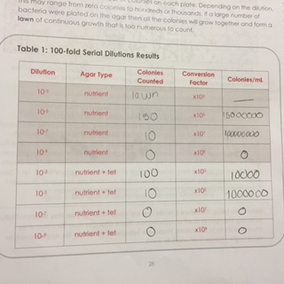 There were recognizable differences between plated colonies where tetracycline was and was not present. The colonies without the antibiotic were more abundant and lighter in color. The colonies where tetracycline existed were yellow/mustard in color and less numerous. These initial results were recorded in Table 1 (below)