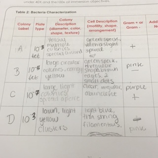 BLAST was unable to identify Sample A. However, Sample D was classified as Chryseobacterium. According to my lab group’s Bacteria Characterization Table, as seen in Lab 3, Sample D’s colony description was a light yellow lawn that grew in clusters. Also, it was categorized as gram negative. Chryseobacterium is a gram negative bacteria that exhibits a similar color and growing pattern as Sample D (Hugo, Segers, Host, Vancanneyt and Kersters, 2003). Due to these similarities, it is appropriate to assume that Sample D is Chryseobacterium.