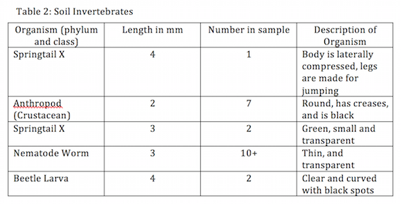 ConclusionAll of the five invertebrate samples that my group was able to identify were common soil invertebrates. The findings are due to the environment from which we collected the leaf samples.