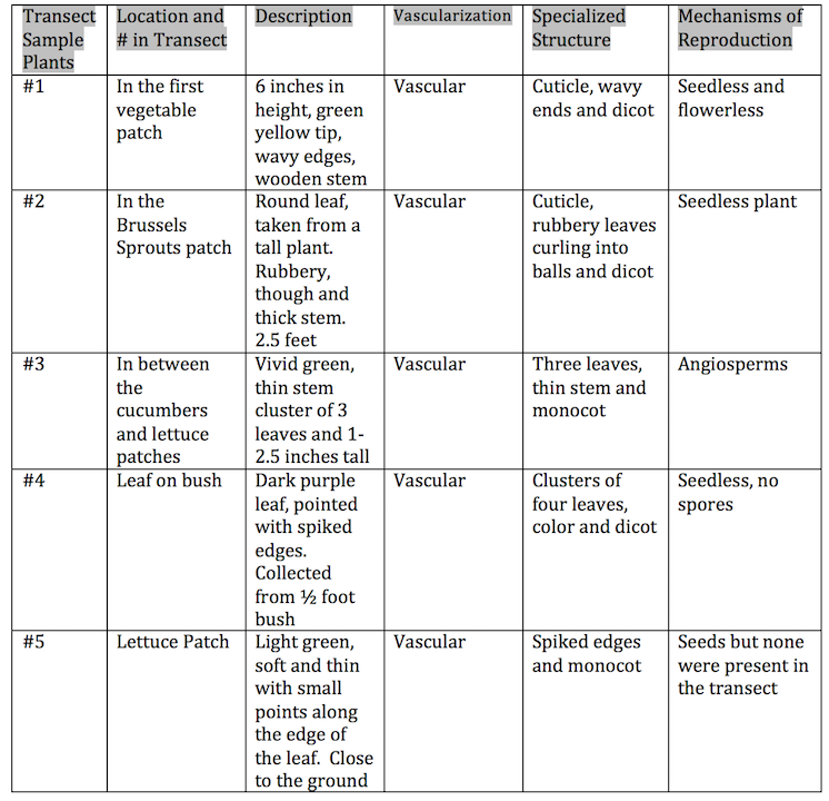 The purpose of this lab is to understand the characteristics and diversity of the plants within the assigned transect. Land plants evolved from aquatic green algae, resembling the modern day phyla of Brophytes. Plants are can be categorized by the following three general features: presence of vascularization, presence of specialized structures and mechanisms of reproduction. In general, the overall purpose of this lab was to observe, identify and classify various plants located in the transect.