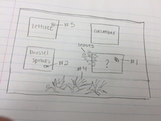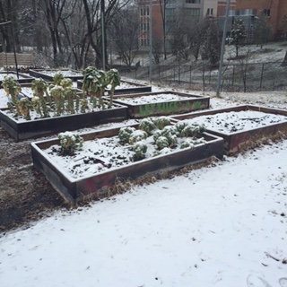 Procedure II The transect was located in American University's Community Garden. Within this transect, there were four rectangle plots. Each plot held a different vegetable and was full of dark soil. Much of the plant life was dead but the brussel sprouts were in full bloom. There were irrigation tubes throughout and between the plots. There were dead bushes and sticks towards the southern end of the transect. Five abiotic components: wood, scarecrow, irrigation, woodchips, snow Five biotic components: cucumber, lettuce, brussel sprouts, spinach, bushes