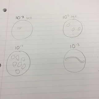 For the bacteria characterization, the following colonies were chosen: 10^-3 with tetracycline, 10^-5 with tetracycline, 10^-7 without tetracycline and 10^-3 without tetracycline The following is a drawing of the wet mount observations under the microscope at 40X.