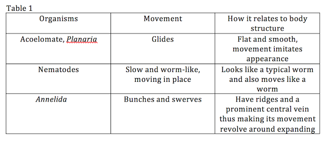 Observe Acoelomates, Pseudocoelomates and Coelomates with a dissecting microscope. Observe the movements of each worm and how this particular movement relates with their body structure.