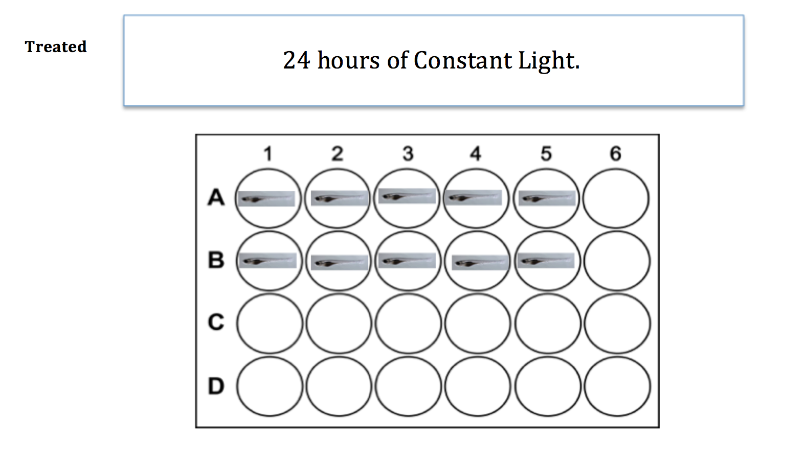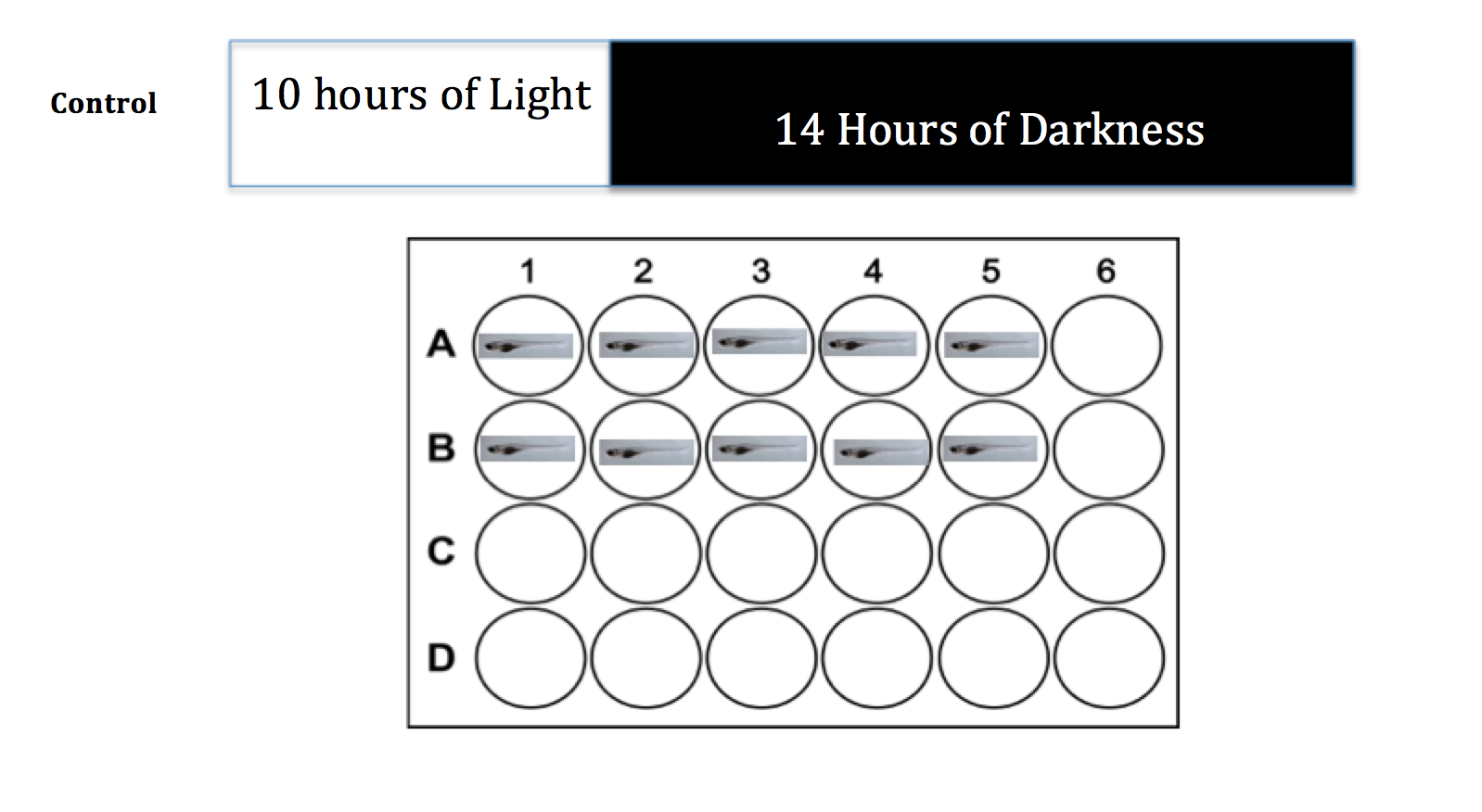 - For our experiment we used 20 zebra fish, 10 that were kept in constant light, 10 of which were kept in cyclical light (10 hours of light, 14 hours of dark). To start, 10 zebra fish embryos were taken out of a large bowl filled with zebra fish embryos and transferred into their own well. The rest of the well was filled with deerpark water. These fish were labeled 1-10 and were kept in constant light for 14 days.