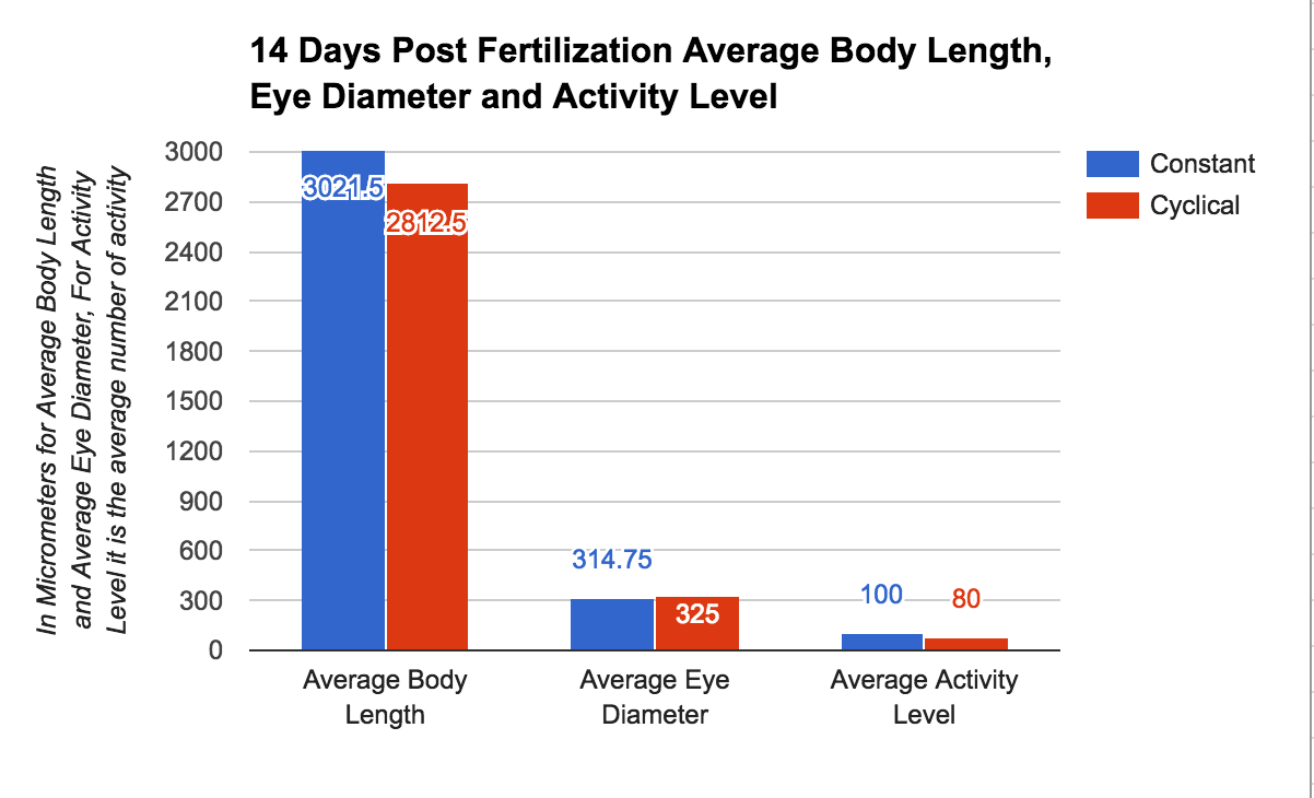 - Overall there appeared to be a change in the body length, eye diameter and activity level of the fish that were exposed to constant light. On average the fish that grew up in constant light were larger in body length and in eye diameter, and appeared to be more active. In the future, the continuation of this experiment would be very beneficial towards the research of how extended light exposure affects the zebra fish’s eyes as well as humans. Ideally the experiment would be longer so that it is much easier to tell the differences between body lengths, eye diameter and activity level into maturity. It would also be helpful if there were a way to look at the physiology inside the zebra fish’s eye. This way the effects of extended light exposure can be looked at internally and externally.