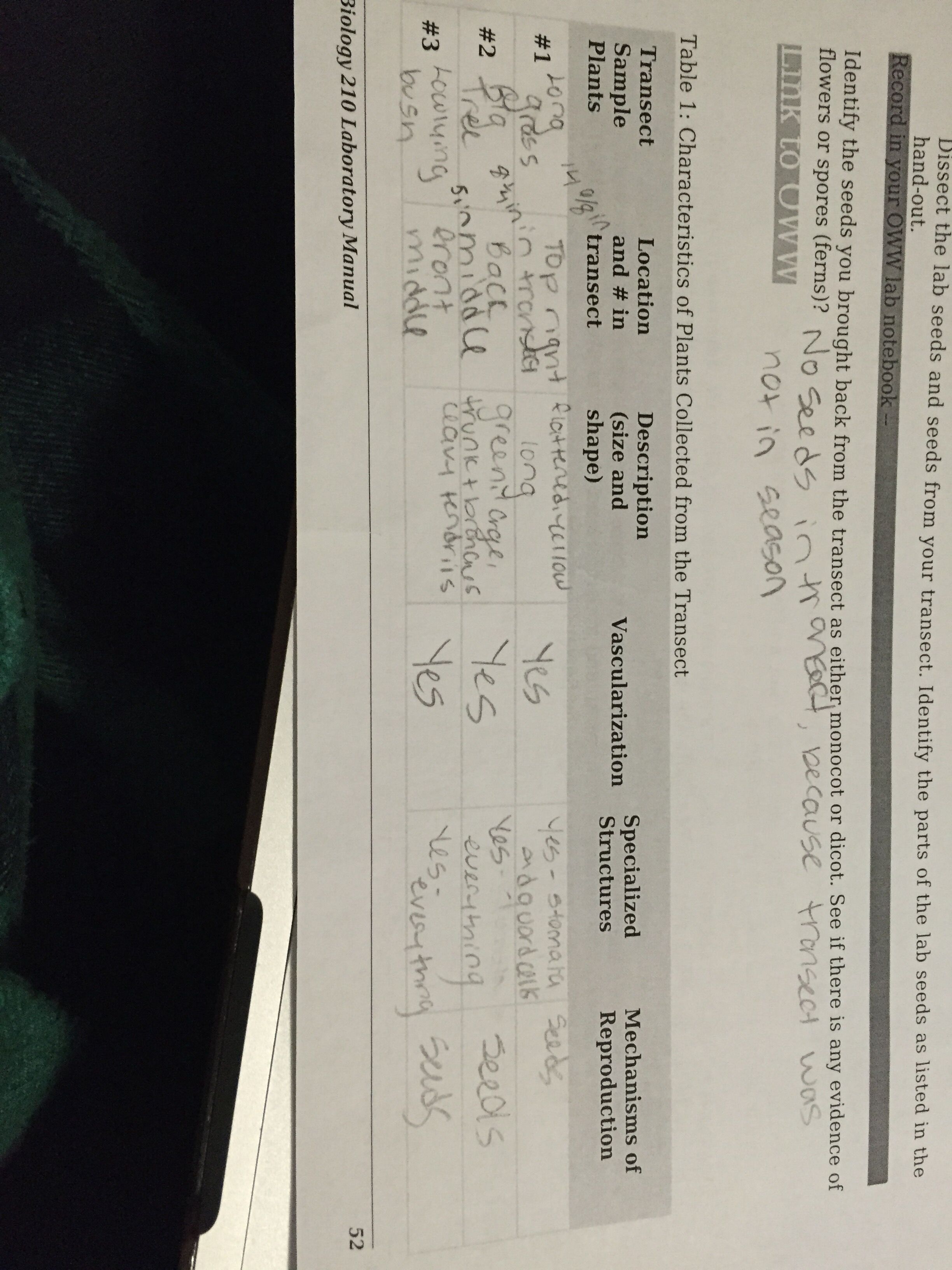 - We first went out to our transect to collect soil samples as well as to identify different sample plants present on our transect. The samples were then put under a microscope to determine the vascularization, identify specialized structures, and to find mechanisms of reproduction.