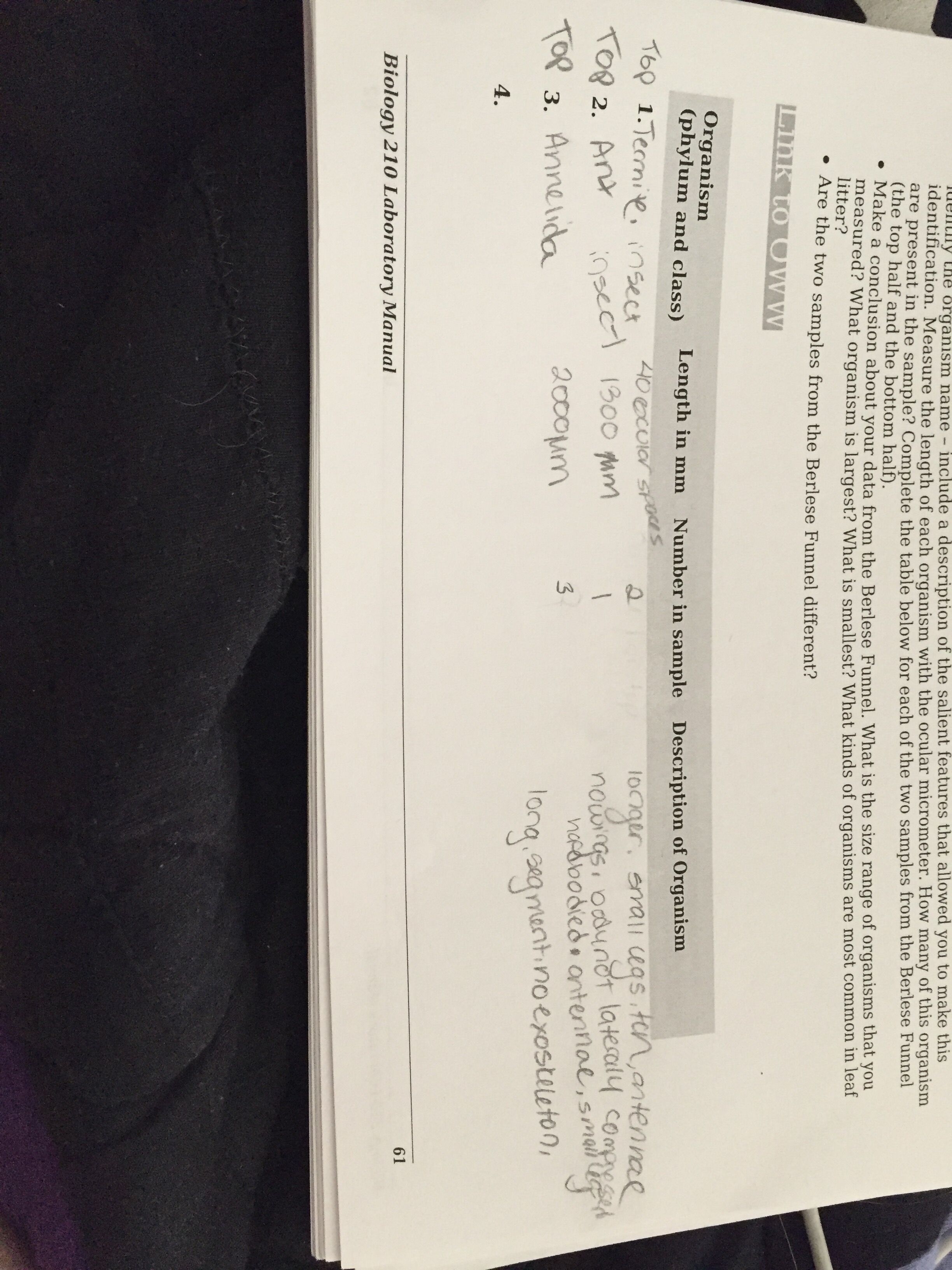 - We put 10-15mL of the 50% ethanol solution and organisms the Berlese Funnel into a petri dish, and the rest of it into a second dish. We then looked at it under a microscope, and identified what kind of anthropods were in our transect. We then found their length, how many were in the sample, what type they were, and a description.