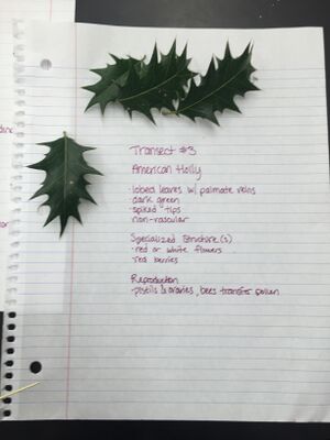 My group members and I went out to our transect again to collect more samples. This time, I collected leaf litter and soil in a gallon-sized plastic bag while the other group members selected several different types of plants to take samples from. Once everything was collected, we brought it back to the lab and began identifying the plants. We searched though guides and databases online to figure out what types of plants were present in our transect. The five plants we collected and identified were: