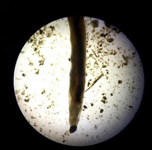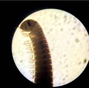 1. Annelida Amelida: 3 in sample at length 400 micrometers. Long body and visible digestive tract.